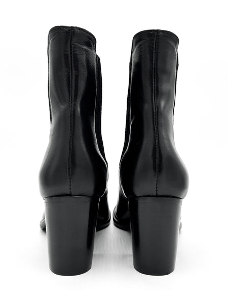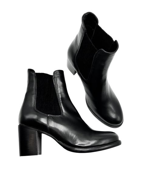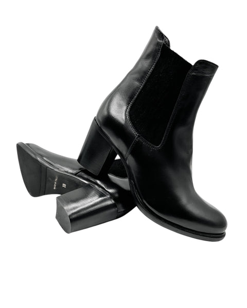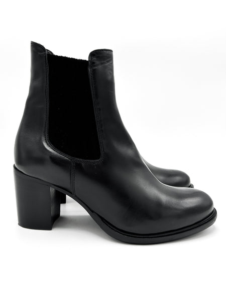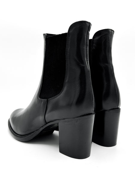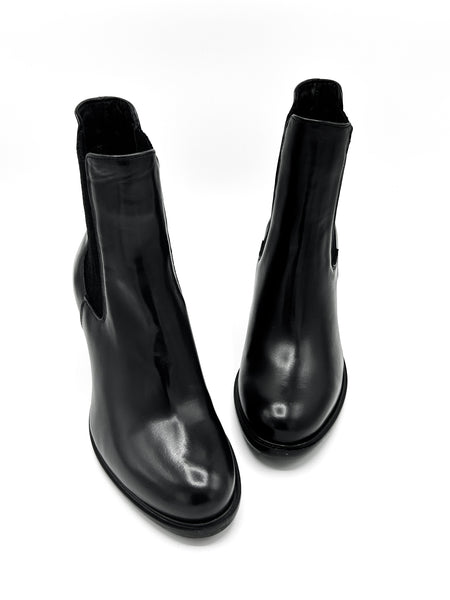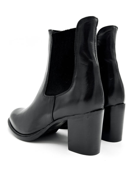 Stivaletto Chelsea con elastici laterali che garantiscono una calzata facile e veloce, sono in pelle nera liscia e resistente, con una finitura lucida e duratura che migliora nel tempo. Il tacco è grosso alto 7 cm, una media altezza che assicura stabilità e supporto.