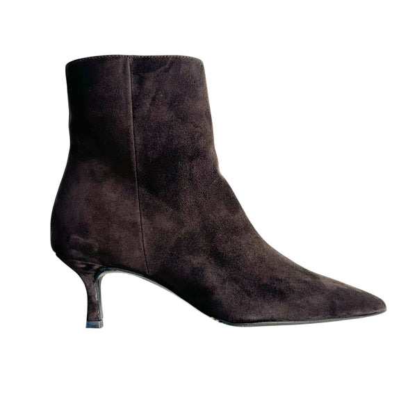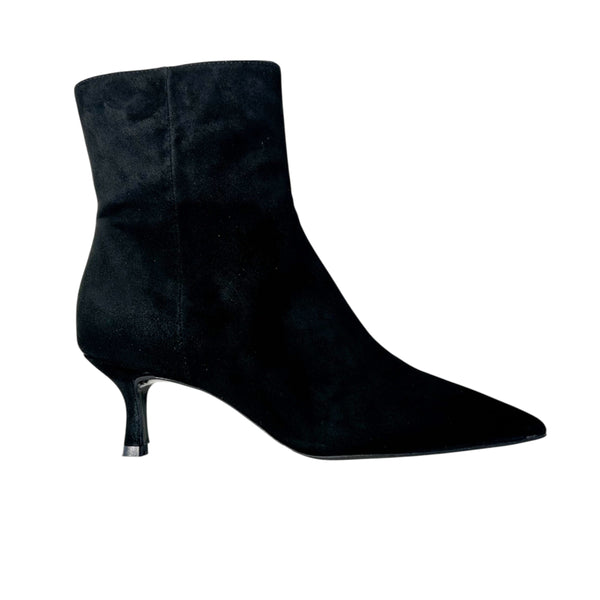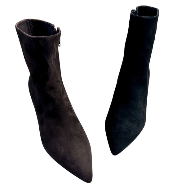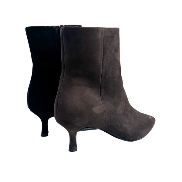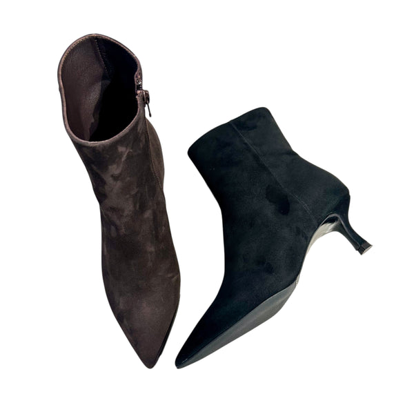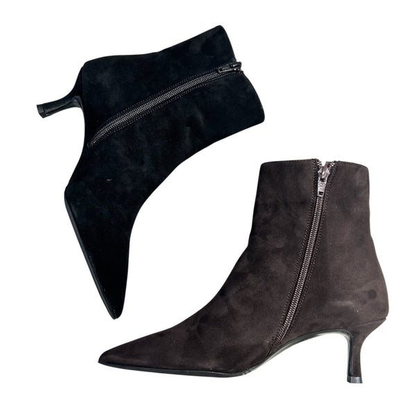 Stivaletti in pelle scamosciata dalla punta sfilata, si allacciano con zip laterale nella parte interna. Il tacco a spillo è alto 5 cm e il fondo è in gomma. Disponibili in due varianti di colore: nero e marrone.