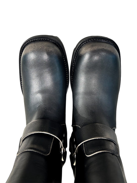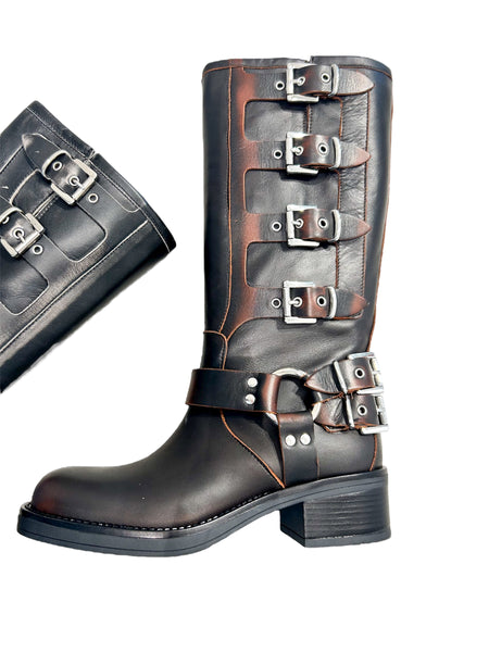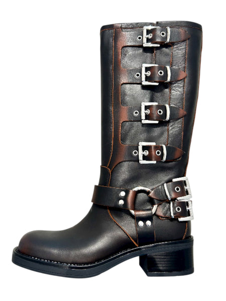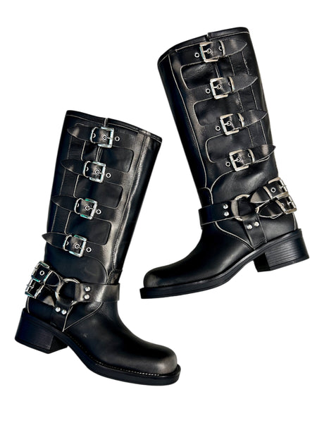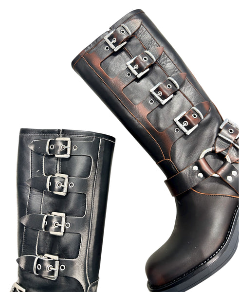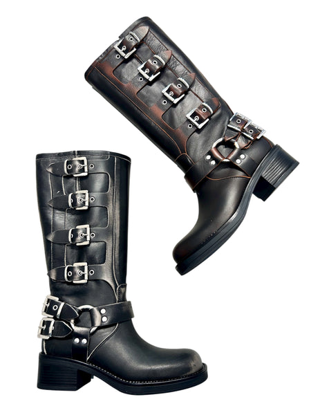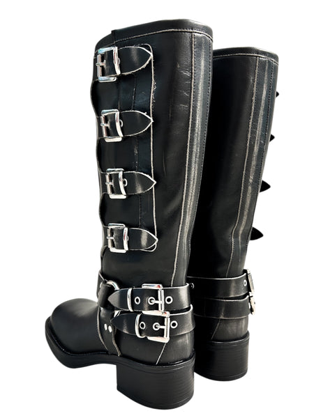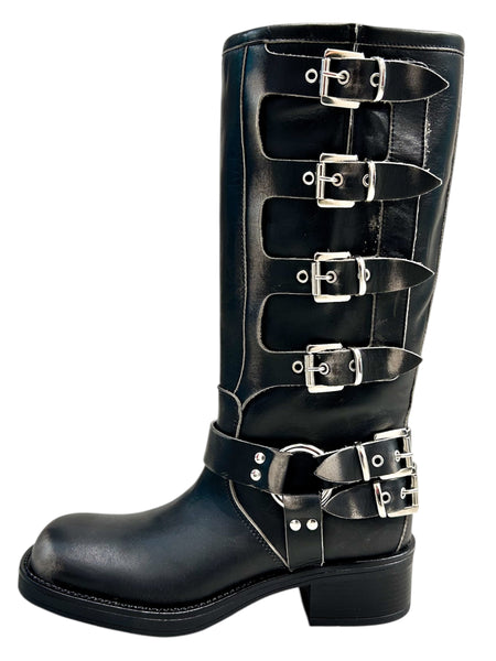 Stivali biker alti a più fibbie con punta squadrata. La tomaia è in pelle liscia nera con effetto scolorito in alcuni punti e il fondo è grintoso in gomma. Non hanno allacciatura.