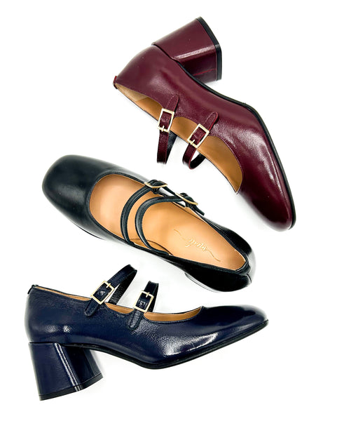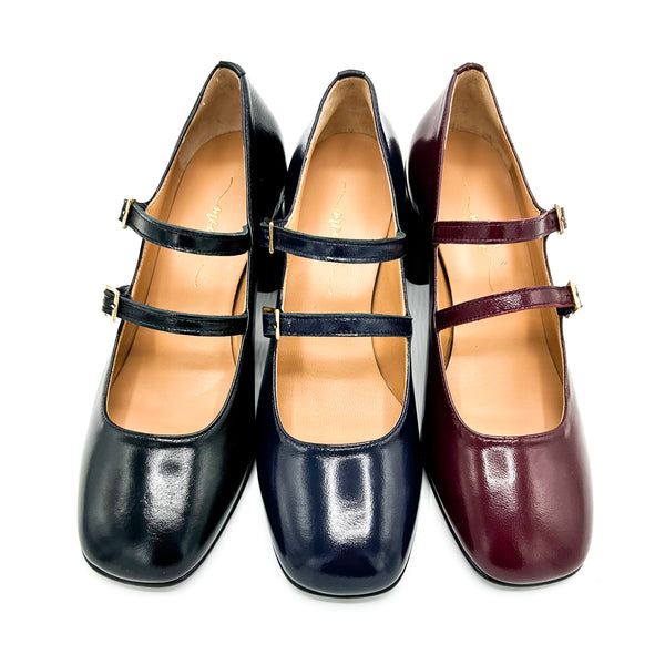 Queste scarpe dall'anima rétro sono realizzate in vernice con doppio cinturino e fibbie color oro. Disponibili in tre varianti di colore: nero blu e bordeaux.