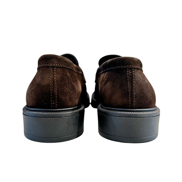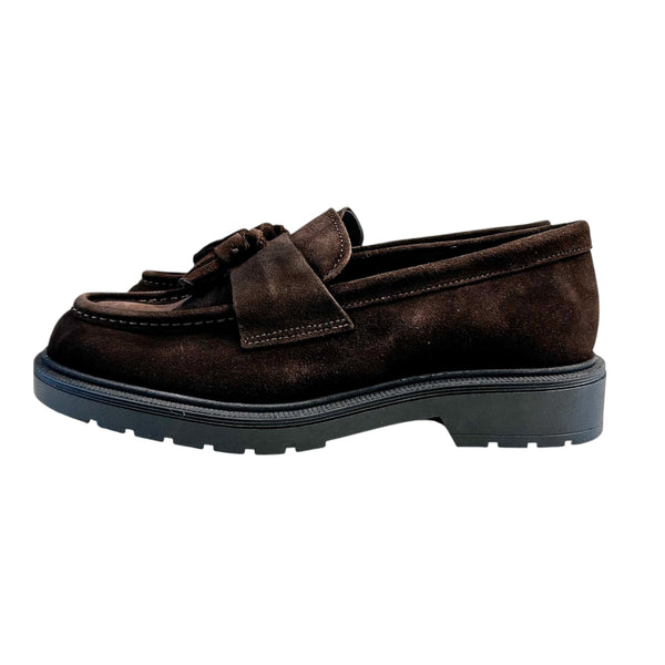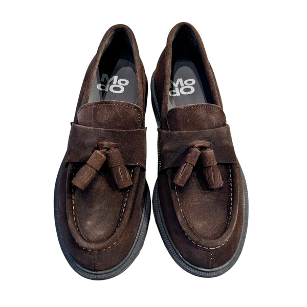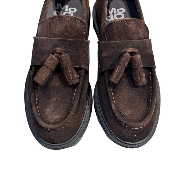 Mocassini in pelle scamosciata marrone con nappine. La tomaia e la fodera interna sono in pelle mentre la suola è in gomma.