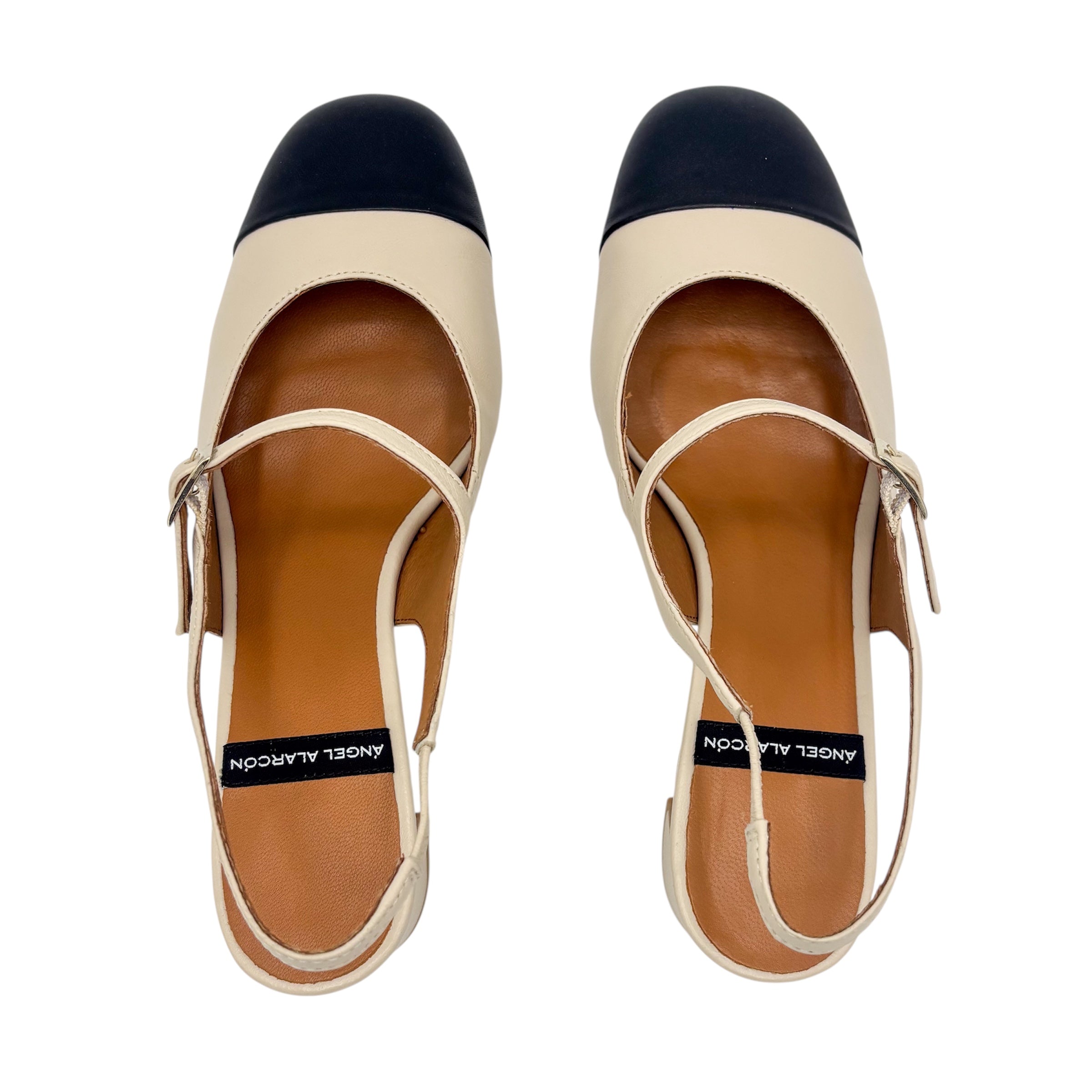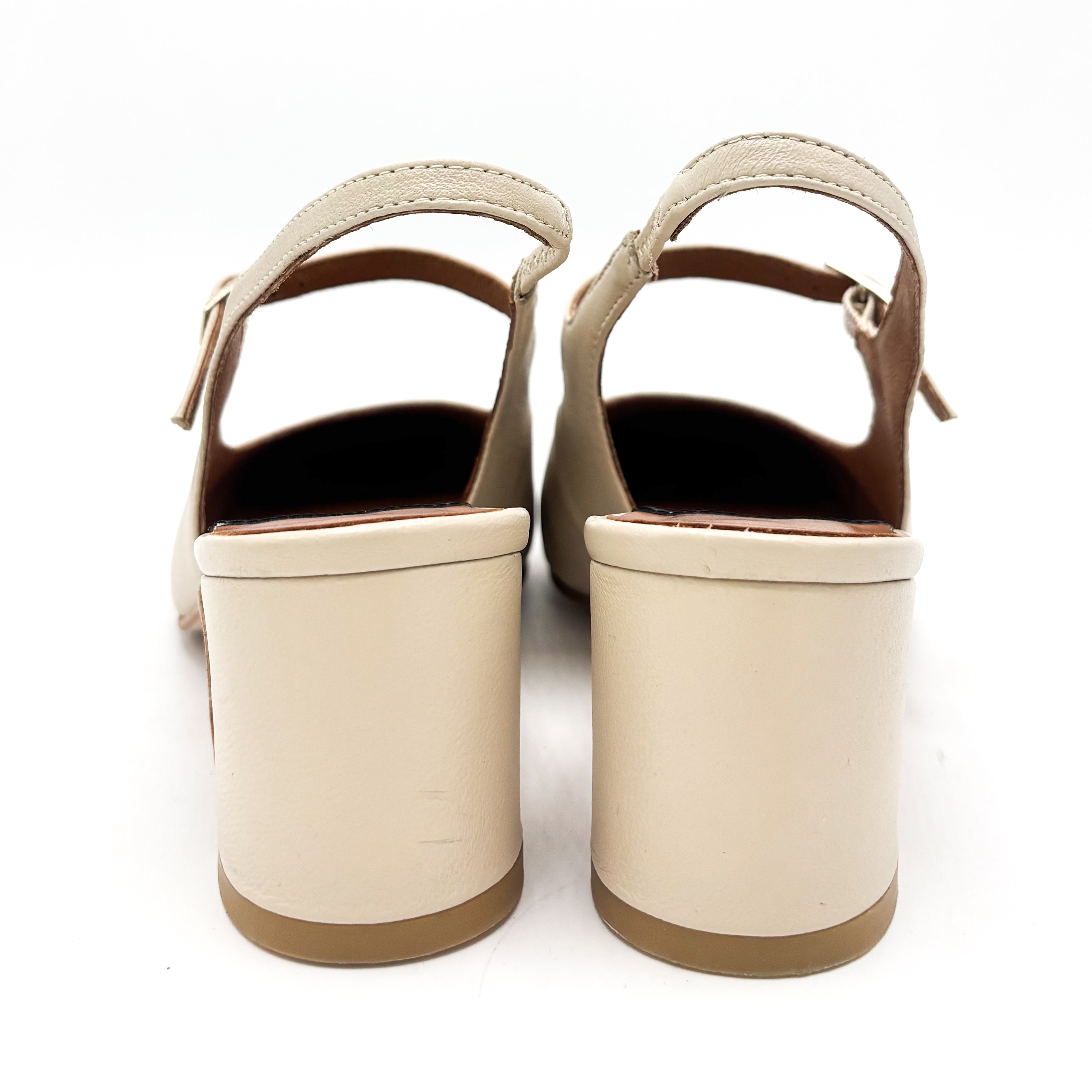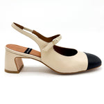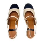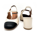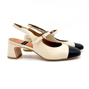 Classico modello di sling Back in pelle color crema con punta leggermente squadrata nera a contrasto. Il tacco squadrato è alto 5 cm.