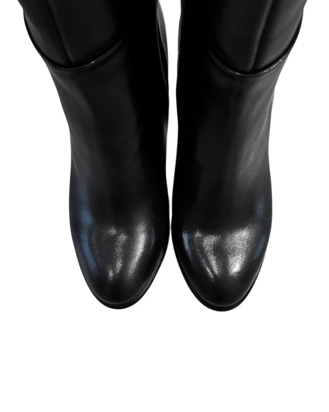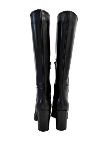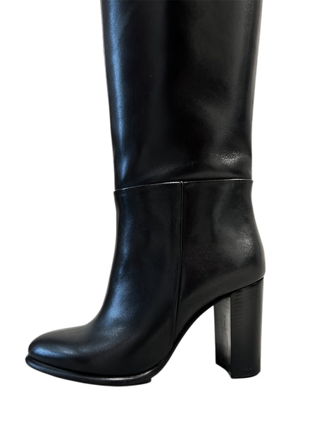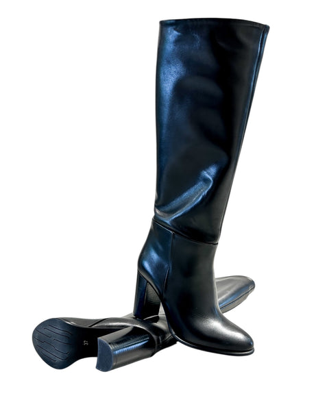 Stivali alti sotto al ginocchio in pelle. Come allacciatura hanno una zip laterale, il fondo è in gomma e il tacco è alto 8 cm.