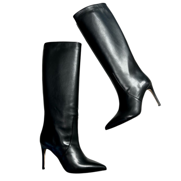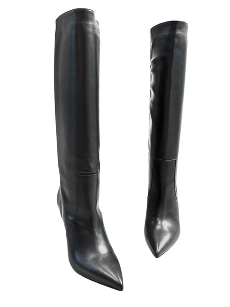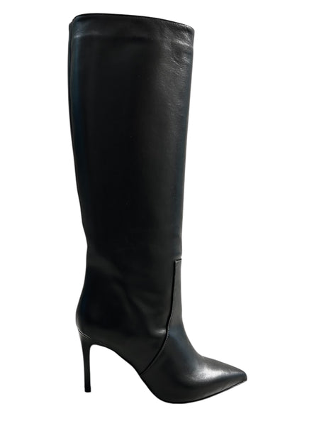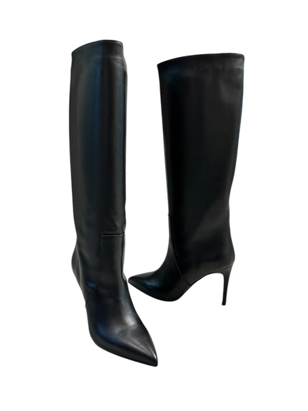 Stivali dalla punta sfilati alti sotto al ginocchio in pelle molto morbida. Non hanno allacciatura, il fondo è in gomma e il tacco a spillo è alto 9 cm.