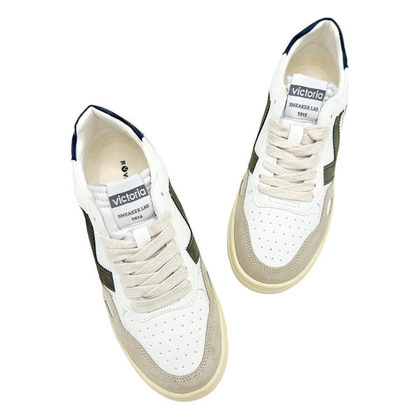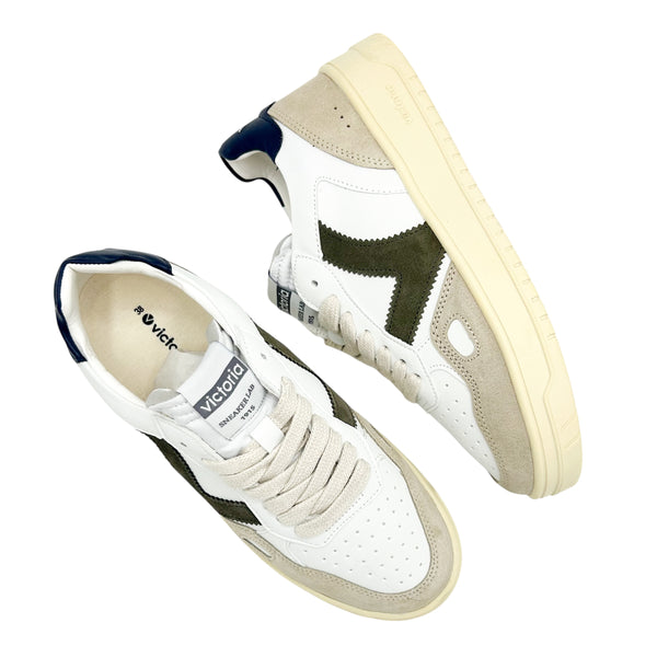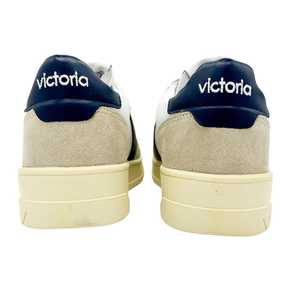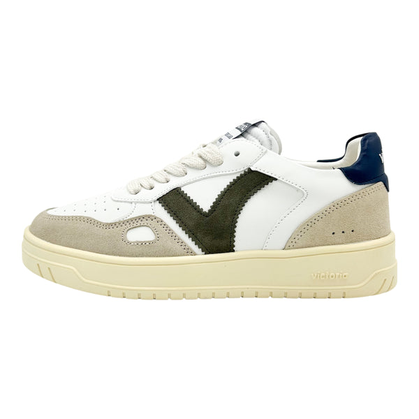 Sneakers Victoria sportive bianche da donna realizzate in materiale effetto pelle. V laterale scamosciata. Presentano un secondo inserto posteriore multicolore in pelle. Punta effetto crosta di pelle. Chiusura con doppio laccio: uno tondo in fibra metallica e uno tono su tono. Dettaglio a finestra sul lato. Suola leggermente ambrata di 3,5 cm. Comprendono una soletta estraibile imbottita per un maggiore comfort.