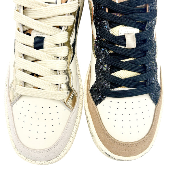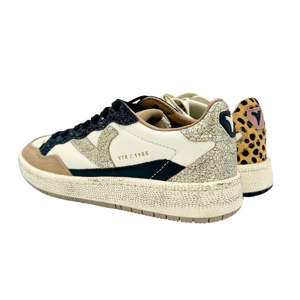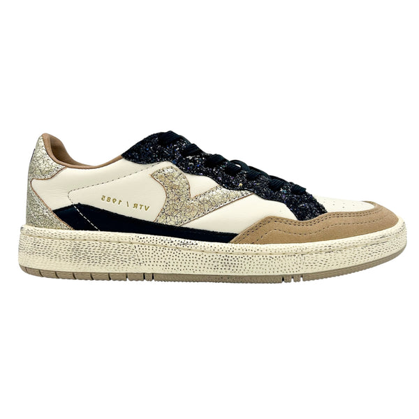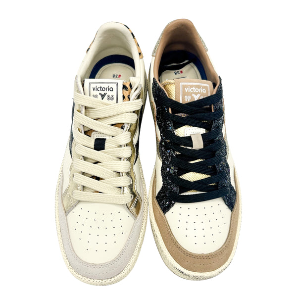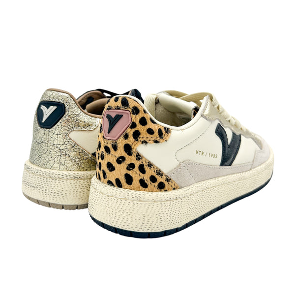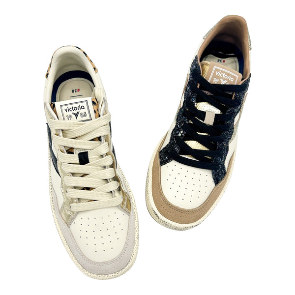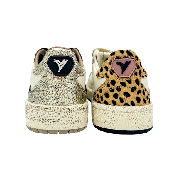 Dal gusto vintage e molto comode, così sono le sneakers Victoria da donna SMASH-ANIMAL della collezione 1985. Realizzate in pelle bovina con inserti in crosta di pelle bovina e pelle metalizzata. Incisione della collezione sul lato e etichetta in gomma in rilievo sul retro. Suola in gomma leggermente ambrata con texture ruvida. Includono una soletta ergonomica che si adatta alla forma del piede regalando una sensazione di comfort.
